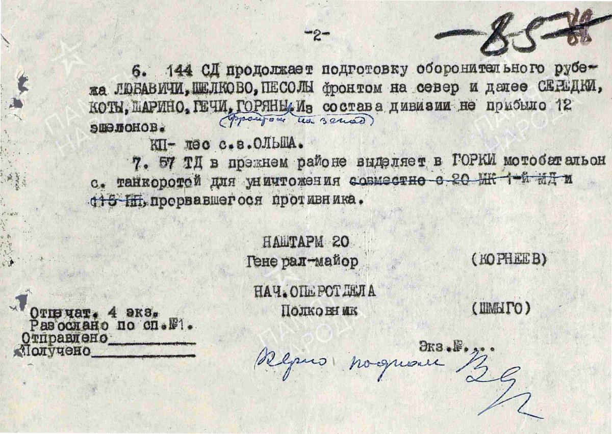Итак, до конца 2023 г. имелась лишь версия автора этой статьи, основанием которой послужили вышеприведенные воспоминания И.Н. Коннова, А.С. Попова и К.Г. Гасникова. Решил проанализировать записи за июль 1941 года в журнале военных действий войск (ЖВДВ) Западного фронта. Выяснилось, что в начале июля командованием этого фронта было принято решение о контрударе на Борисов и на Лепель-Сенно (1) [19], (1) [20], (1) [21]. Причем под Коханово войска Вермахта 4 дня не могли прорвать оборону советских войск (1,2,3) [22].