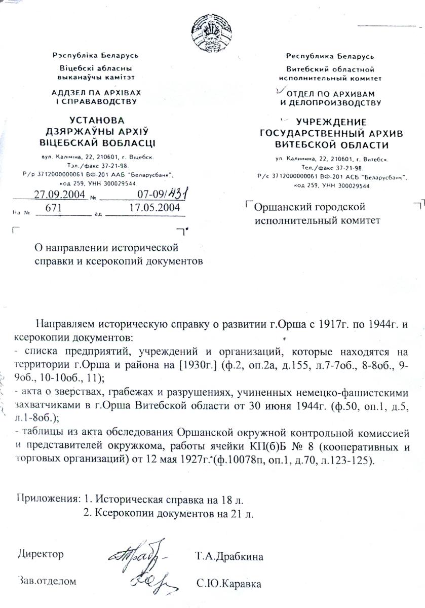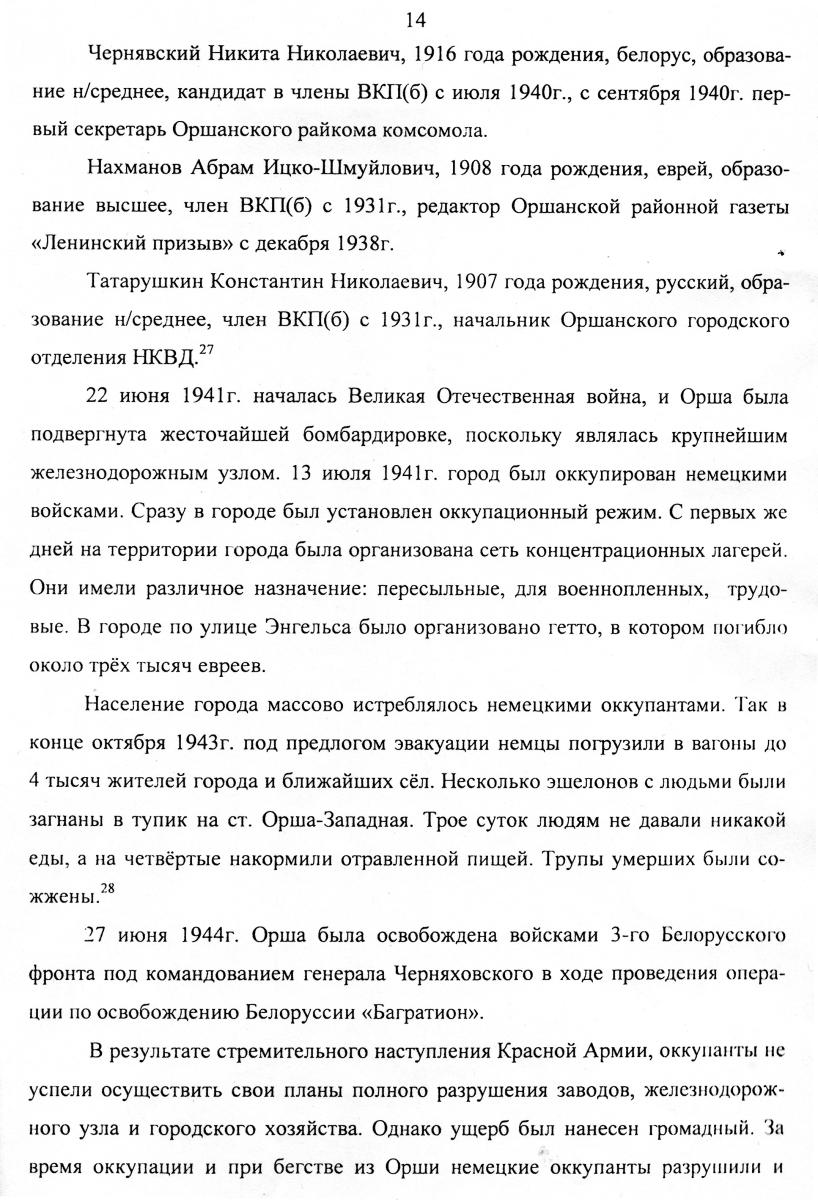 Таким образом, точки над «i» о дате начала немецкой оккупации с 13 июля 1941 г. поставили российские представители академической военно-исторической науки – Центра по изучению истории Великой Отечественной войны Российской Академии наук. О том, что Орша немецкими войсками была оккупирована с 13 июля 1941 г. свидетельствует и архивная справка о развитии города Орша с 1917 г. по 1944 г., составленная сотрудниками Витебского областного архива, где отмечено, что г. Орша немецкими войсками был оккупирован с 13 июля 1941 г. (1,2) [71].