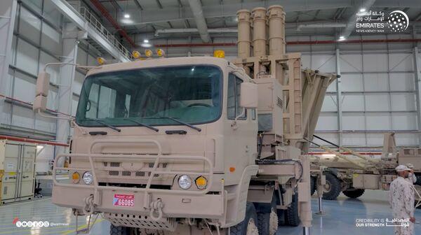 Кадр из видео, опубликованного 11 мая 2025 года, показывает пусковую установку M-SAM II с пусковой установкой THAAD позади на авиабазе Аль-Дафра в ОАЭ. (Информационное агентство Эмиратов (WAM))
