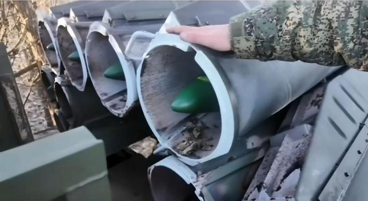 Отталкиваясь от свежего скрина из недавнего репортажа Александра Рогаткина об особенностях боевого применения 300-мм РСЗО 9К515 "Торнадо-С", можно прийти к выводу о состоявшейся интеграции в боекомплект системы новых (ранее неизвестных) управляемых реактивных снарядов с предполагаемыми индексами 9М557/9М558. Их можно идентифицировать по характерной аэродинамической компоновке обтекателя.